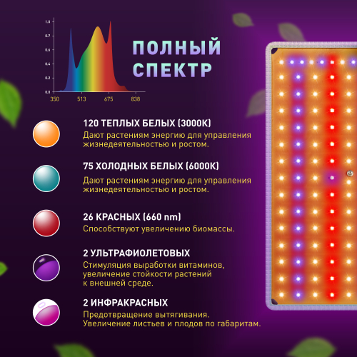 Квантум борд позволяет создать мощную световую волну направленную на рост растений без перегрева корпусов светодиодов, без теплового эффекта от нагрева корпуса на листья растения. Полный спектр свечения подходит для всех культур и является универсальным.