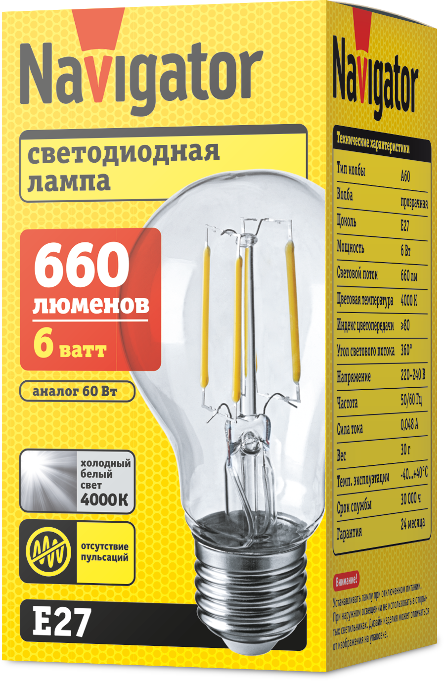 Мощность лампы составляет 6 Вт, цветовая температура — 4000 К, а световой поток — 660 лм.