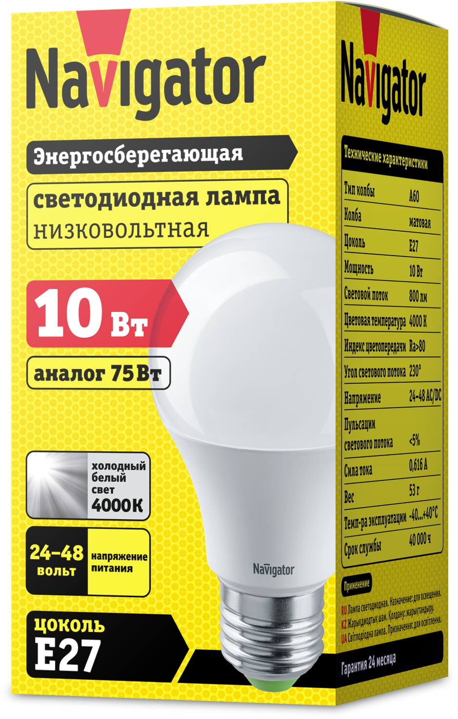 Лампа Navigator 61 476 NLL-A60-10-24/48-4K-E27 предназначена для использования в осветительных приборах с напряжением питания от 12 до 48 В.