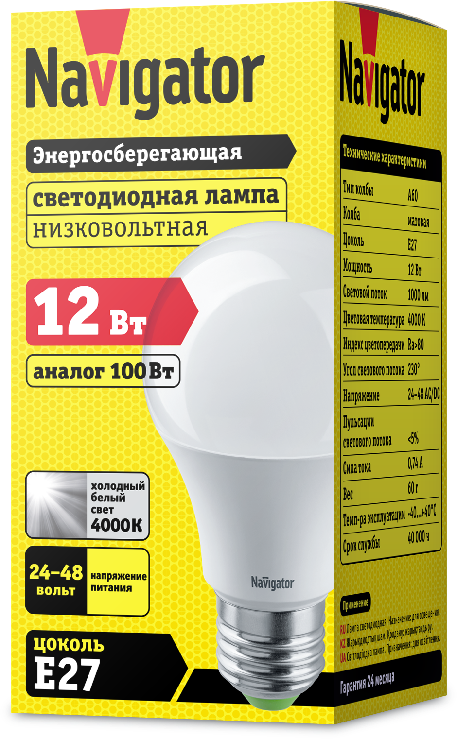 Лампа Navigator 61 477 NLL-A60-12-12/24-4K-E27 разработана для эксплуатации в светильники с напряжением питания от 12 до 48 В.