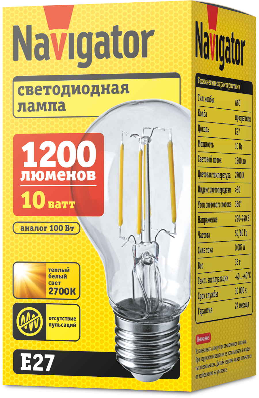 Лампа имеет мощность 10 Вт, цветовую температуру 2700 К и световой поток 1200 лм.