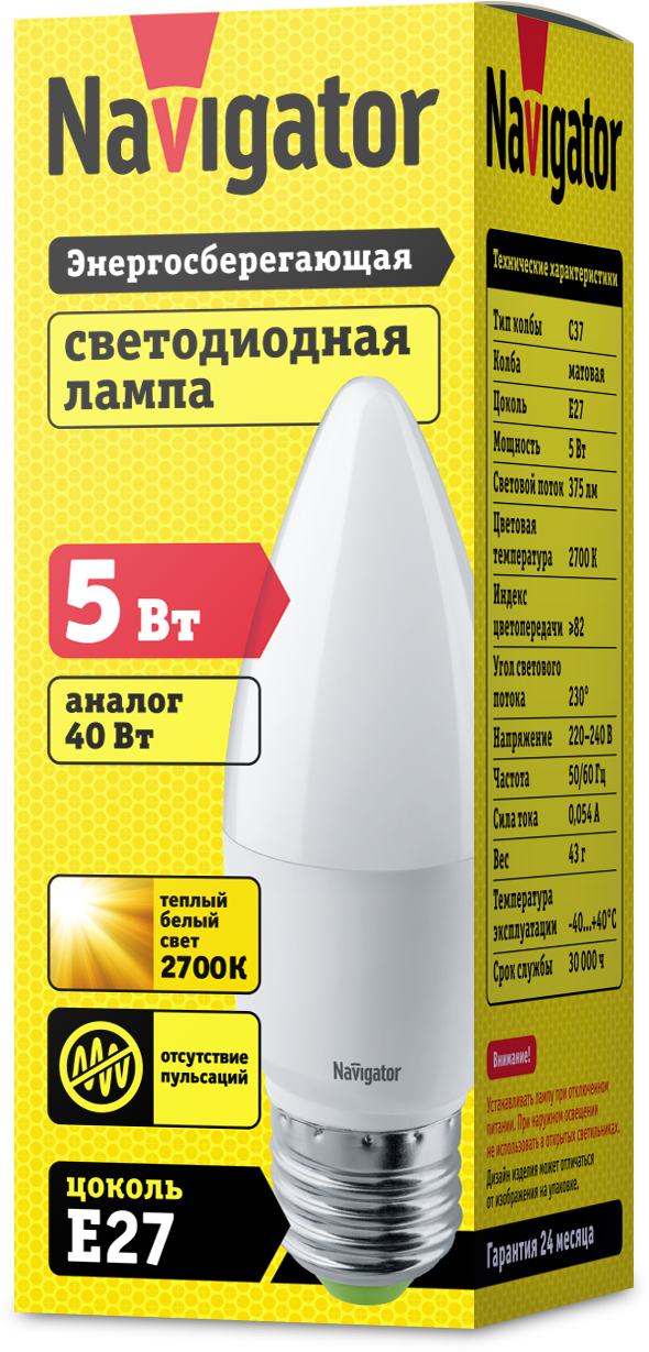 Лампа Navigator 94 481 NLL-P-C37-5-230-2.7K-E27-FR мощностью 5 Вт использует мало энергии.