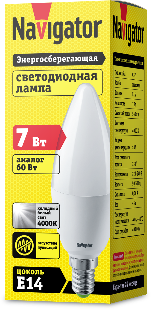 Лампа Navigator 94 492 NLL-C37-7-230-4K-E14-FR представляет собой энергоэффективное осветительное устройство мощностью 7 Вт.