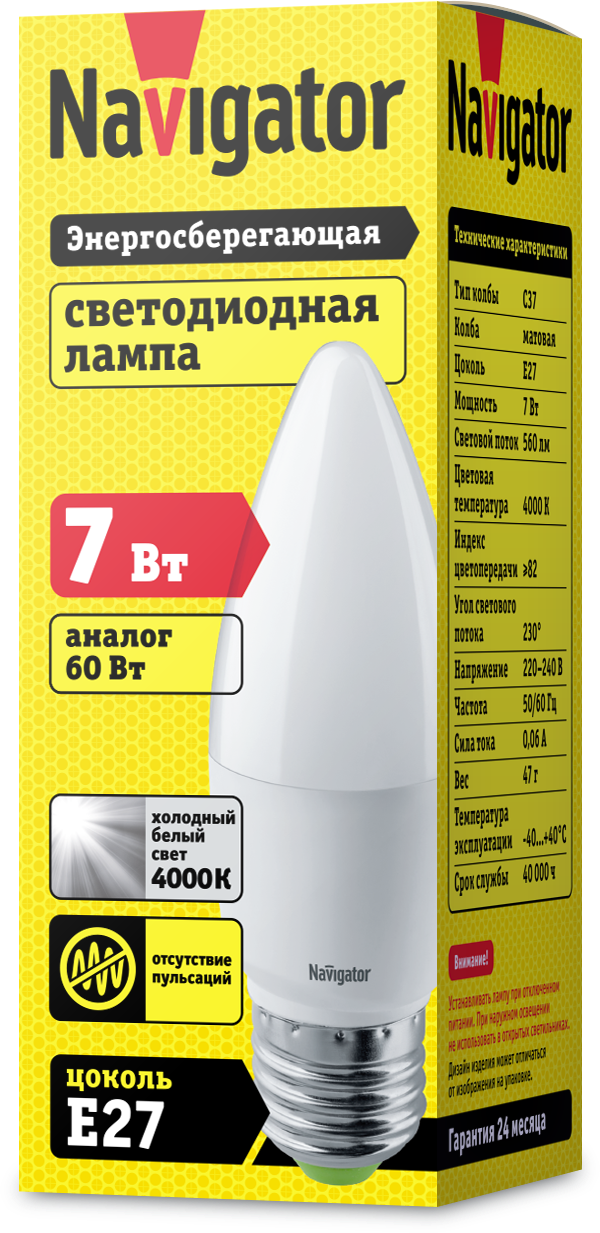 Светодиодная лампа Navigator 94 494 NLL-C37-7-230-4K-E27-FR мощностью 7 Вт имеет сравнительно небольшой расход энергии.