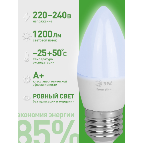 Светодиодная лампа ЭРА LED B35-12W-865-E27 GL серии Green Line — это яркий и экономичный источник света, заменяющий лампы накаливания. Лампочка с цоколем Е27 и мощностью 12 Вт излучает холодный белый свет (6500K) без мерцания. Элегантная форма B35 (свеча) и стандартный цоколь E27 позволяют использвать лампу в люстрах, бра, настольных и декоративных светильниках. Высота лампы: 100 мм. Работает от сети 220 В, эквивалентна 120 Вт лампе накаливания. Светодиодные лампы ЭРА потребляют минимум энергии и не нагреваются. Подходят для дома, гостиниц, ресторанов и коммерческих помещений, сочетая стиль и функциональность.