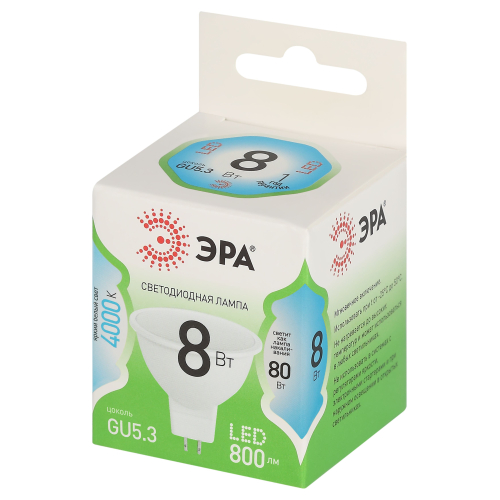 Светодиодная лампа ЭРА LED MR16-8W-840-GU5.3 GL серии Green Line — современный и энергоэффективный источник света. Лампочка мощностью 8 Вт с цоколем GU5.3 излучает нейтральный белый свет (4000K) без мерцания. Форма MR16 с отражателем обеспечивает направленный световой поток и идеально подходит для акцентного и основного освещения: в точечных светильниках, трековых системах, витринах и подвесных конструкциях. Потребляет минимум энергии, не нагревается, устойчива к перепадам напряжения и обеспечивает стабильное свечение. Работает от сети 220 В, эквивалентна 80 Вт лампе накаливания. Отличное решение для дома, офисов, магазинов, кафе и гостиниц.
