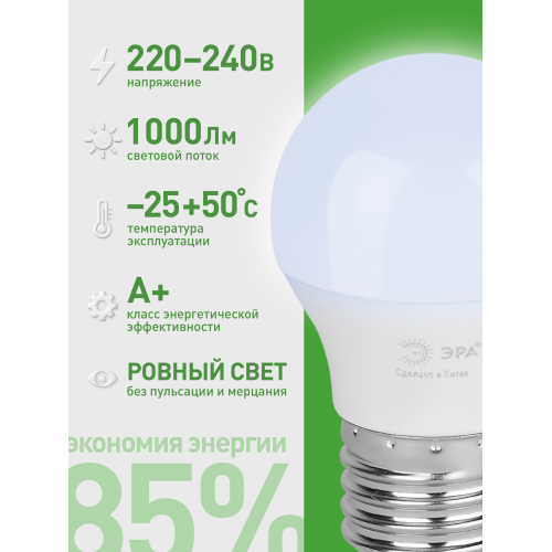 Светодиодная лампа ЭРА LED P45-10W-865-E27 GL серии Green Line — компактный и энергоэффективный источник света. Лампочка мощностью 10 Вт с цоколем E27 излучает холодный белый свет (6500K), создавая комфортное и равномерное освещение. Высота лампы: 80 мм. Форма P45 (шар) и небольшой размер делают её отличным выбором для настольных ламп, бра, торшеров и декоративных светильников. Отличается низким энергопотреблением, долгим сроком службы и устойчивостью к перепадам напряжения. Работает от сети 220 В, эквивалентна 100 Вт лампе накаливания. Обеспечивает стабильное свечение без мерцания, идеально подходит для дома, гостиниц, кафе и коммерческих помещений.