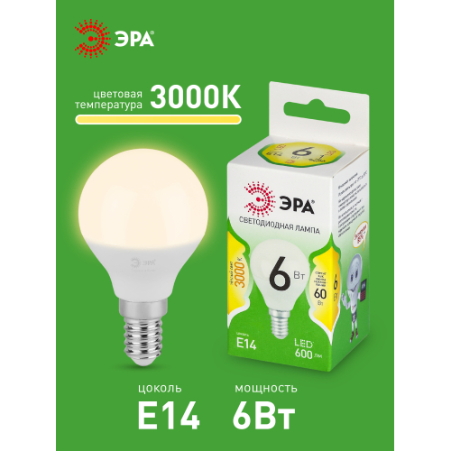 Светодиодная лампа ЭРА LED P45-6W-830-E14 GL серии Green Line — компактный и энергоэффективный источник света. Лампочка мощностью 6 Вт с цоколем E14 излучает теплый белый свет (3000K), создавая комфортное и равномерное освещение. Высота лампы: 80 мм. Форма P45 (шар) и небольшой размер делают её отличным выбором для настольных ламп, бра, торшеров и декоративных светильников. Отличается низким энергопотреблением, долгим сроком службы и устойчивостью к перепадам напряжения. Работает от сети 220 В, эквивалентна 60 Вт лампе накаливания. Обеспечивает стабильное свечение без мерцания, идеально подходит для дома, гостиниц, кафе и коммерческих помещений.
