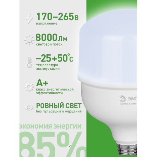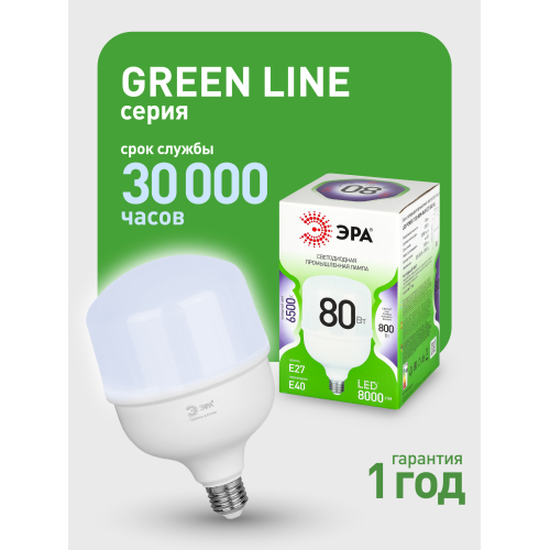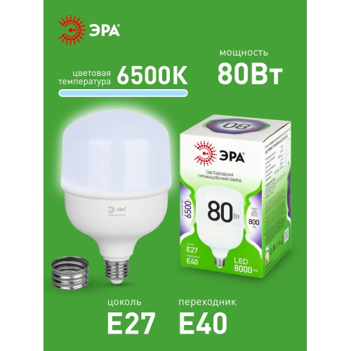 Светодиодная лампа ЭРА LED POWER T120-80W-865-E27/E40 GL серии Green Line — универсальный и энергоэффективный источник света. В комплекте предусмотрен сменный цоколь Е40, что позволяет использовать лампочку в различных помещениях. Цветовая температура 6500К излучает холодный белый свет без мерцаний. Высота лампы: 195 мм. Плафон в форме колокола обеспечивает равномерное распределение света. Лампочка ЭРА Е27 отличается низким энергопотреблением, долгим сроком службы и устойчивостью к перепадам напряжения. Работает от сети 220 В, эквивалентна 800 Вт лампе накаливания. Подходит для освещения жилых помещений, офисов, магазинов и производственных площадей.