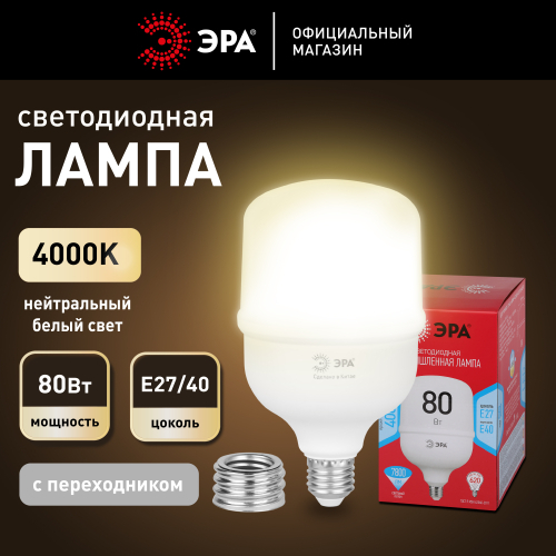 Светодиодная лампа повышенной мощности ЭРА RED LINE LED POWER T140-80W-4000-E27/E40 R идеальна для качественного и экономичного освещения пространств с большой площадью производственных, торговых, выставочных, складских, подсобных помещений. Светит ярко, как лампа накаливания 620 Вт, при этом потребляет мощность всего 80 Вт. Экономит до 90% электроэнергии. Создаёт комфортное для глаз освещение нейтрального белого цвета. Не нагревается, включается мгновенно, не мигает. Размеры: 225 х 138 мм. Цоколь Е27/E40