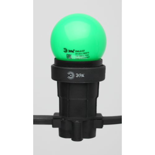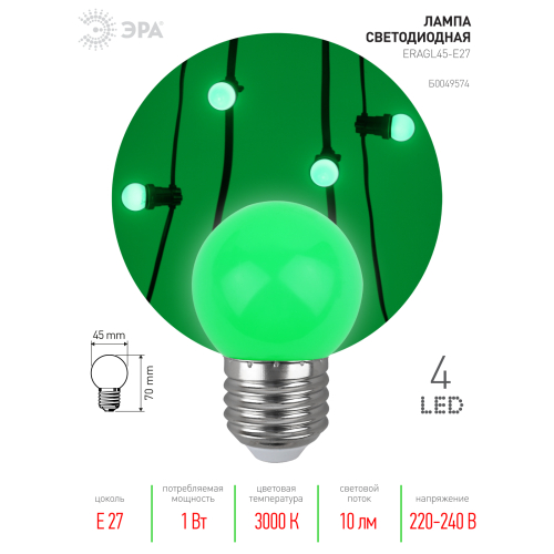 Декоративная светодиодная лампа ЭРА "Белт-лайт" с цоколем Е27 и колбой шар (Р45) зелёного цвета. Мощность - 1 Вт. Идеально подходит для использования в уличной гирлянде-конструкторе ЭРА "Белт-лайт", дающей возможность самостоятельного дизайна и монтажа праздничной иллюминации. В составе гирлянды-конструктора позволяет создавать уникальное праздничное освещение по индивидуальным параметрам и для конкретных задач. Вы сами выбираете длину подсветки, цвет ламп и расстояние между источниками света! Это идеальное решение для декора фасадов зданий, оформления витрин, общественных пространств на свежем воздухе. Другие элементы гирлянды-конструктора: патрон Б0049176, кабель Б0049175, набор для подключения (шнур питания с вилкой + коннектор) Б0049180, коннектор Б0049179, заглушка Б0049181, заглушка с крюком Б0049182. В ассортименте ЭРА LED-лампы "Белт-лайт" E27 разных цветов, в том числе прозрачные и матовые белые. Колбы изготовлены из лёгкого ударопрочного пластика, такие лампы удобно транспортировать, использовать и хранить. Цоколь - из алюминия. Лампы ЭРА "Белт-лайт" универсальны: подходят к любому светотехническому прибору с патроном для Е27. Создают необычное цветное свечение определённого оттенка. Помогают воплощать в жизнь смелые дизайнерские идеи.