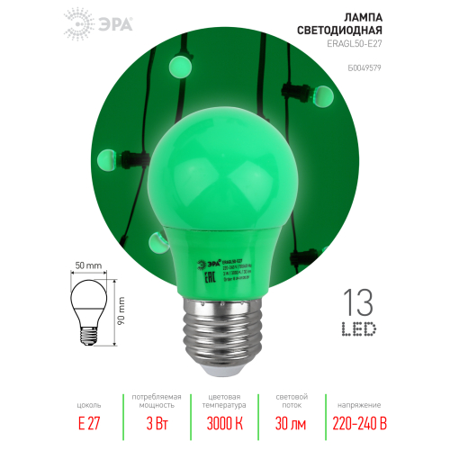 Декоративная светодиодная лампа ЭРА "Белт-лайт" с цоколем Е27 и колбой груша (А50) зелёного цвета. Мощность - 3 Вт. Идеально подходит для использования в гирлянде-конструкторе ЭРА "Белт-лайт", дающей возможность самостоятельного дизайна и монтажа праздничной иллюминации. В составе гирлянды-конструктора позволяет создавать уникальное праздничное освещение по индивидуальным параметрам и для конкретных задач. Вы сами выбираете длину подсветки, цвет ламп и расстояние между источниками света! Это идеальное решение для оформления витрин, общественных пространств. Другие элементы гирлянды-конструктора: патрон Б0049176, кабель Б0049175, набор для подключения (шнур питания с вилкой + коннектор) Б0049180, коннектор Б0049179, заглушка Б0049181, заглушка с крюком Б0049182. В ассортименте ЭРА LED-лампы "Белт-лайт" E27 разных цветов, в том числе прозрачные и матовые белые. Колбы изготовлены из лёгкого ударопрочного пластика, такие лампы удобно транспортировать, использовать и хранить. Цоколь - из алюминия. Лампы ЭРА "Белт-лайт" универсальны: подходят к любому светотехническому прибору с патроном для Е27. Создают необычное цветное свечение определённого оттенка. Помогают воплощать в жизнь смелые дизайнерские идеи.
