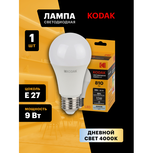 Представляем Вашему вниманию новинку от легендарного бренда Kodak - светодиодные лампочки, которые украсят Ваш интерьер и наполнят дом светом! Лампы всемирно известной марки отличаются традиционно высоким качеством, продолжительным сроком службы, эксплуатационной надежностью, и, конечно, доступной ценой. LED KODAK A60-9W-840-E27 - лампочка с цоколем E27, отлично подойдет для самых разных целей: ее можно установить в люстру или светильник на кухне, в спальне, детской комнате или коридоре. Мощность лампы составляет 9Вт, эквивалент лампе накаливания - 80Вт. Цветовая температура - 4000К - нейтральный белый свет, похожий на дневной. Такой свет идеально подойдет для комфортного пребывания в помещении, лампу можно использовать как для жилых, так и для рабочих зон. Диаметр лампочки составляет 60мм, а высота - 108мм. Корпус устройств выполнен из высококачественных алюминия и термо пластика, что делает использование источников света абсолютно безопасным. Невозможно оставить без внимания неоспоримые преимущества технологии, в которой выполнены лампы: LED (светодиоды KODAK). В первую очередь, это высокая светоотдача и низкое энергопотребление: эти источники света тратят в 10 раз меньше, чем лампы накаливания. Срок службы - 35000 часов - более чем 3,5 года постоянного свечения. Еще одно преимущество - светодиоды не содержат в себе ртути и прочих вредных металлов. Купив лампу от Kodak, Вы сможете быть уверены в высоком качестве продукта и безопасности своих близких.