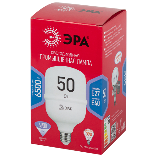 Светодиодная лампа повышенной мощности ЭРА RED LINE LED POWER T100-50W-6500-E27/E40 R идеальна для качественного и экономичного освещения пространств с большой площадью производственных, торговых, выставочных, складских, подсобных помещений. Светит ярко, как лампа накаливания 390 Вт, при этом потребляет мощность всего 50 Вт. Экономит до 90% электроэнергии. Светит холодным белым светом, который способствует концентрации внимания и повышает работоспособность. Не нагревается, включается мгновенно, не мигает. Размеры: 178 х 102 мм. Цоколь Е27/E40
