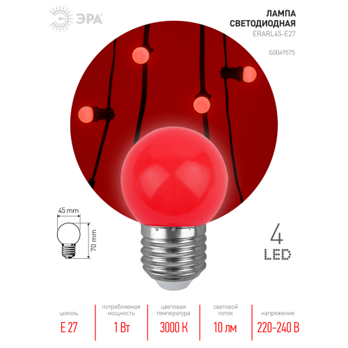 Декоративная светодиодная лампа ЭРА "Белт-лайт" с цоколем Е27 и колбой шар (Р45) красного цвета. Мощность - 1 Вт. Идеально подходит для использования в уличной гирлянде-конструкторе ЭРА "Белт-лайт", дающей возможность самостоятельного дизайна и монтажа праздничной иллюминации. В составе гирлянды-конструктора позволяет создавать уникальное праздничное освещение по индивидуальным параметрам и для конкретных задач. Вы сами выбираете длину подсветки, цвет ламп и расстояние между источниками света! Это идеальное решение для декора фасадов зданий, оформления витрин, общественных пространств на свежем воздухе. Другие элементы гирлянды-конструктора: патрон Б0049176, кабель Б0049175, набор для подключения (шнур питания с вилкой + коннектор) Б0049180, коннектор Б0049179, заглушка Б0049181, заглушка с крюком Б0049182. В ассортименте ЭРА LED-лампы "Белт-лайт" E27 разных цветов, в том числе прозрачные и матовые белые. Колбы изготовлены из лёгкого ударопрочного пластика, такие лампы удобно транспортировать, использовать и хранить. Цоколь - из алюминия. Лампы ЭРА "Белт-лайт" универсальны: подходят к любому светотехническому прибору с патроном для Е27. Создают необычное цветное свечение определённого оттенка. Помогают воплощать в жизнь смелые дизайнерские идеи.