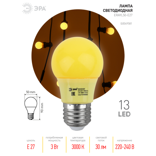 Декоративная светодиодная лампа ЭРА "Белт-лайт" с цоколем Е27 и колбой груша (А50) жёлтого цвета. Мощность - 3 Вт. Идеально подходит для использования в гирлянде-конструкторе ЭРА "Белт-лайт", дающей возможность самостоятельного дизайна и монтажа праздничной иллюминации. В составе гирлянды-конструктора позволяет создавать уникальное праздничное освещение по индивидуальным параметрам и для конкретных задач. Вы сами выбираете длину подсветки, цвет ламп и расстояние между источниками света! Это идеальное решение для оформления витрин, общественных пространств. Другие элементы гирлянды-конструктора: патрон Б0049176, кабель Б0049175, набор для подключения (шнур питания с вилкой + коннектор) Б0049180, коннектор Б0049179, заглушка Б0049181, заглушка с крюком Б0049182. В ассортименте ЭРА LED-лампы "Белт-лайт" E27 разных цветов, в том числе прозрачные и матовые белые. Колбы изготовлены из лёгкого ударопрочного пластика, такие лампы удобно транспортировать, использовать и хранить. Цоколь - из алюминия. Лампы ЭРА "Белт-лайт" универсальны: подходят к любому светотехническому прибору с патроном для Е27. Создают необычное цветное свечение определённого оттенка. Помогают воплощать в жизнь смелые дизайнерские идеи.