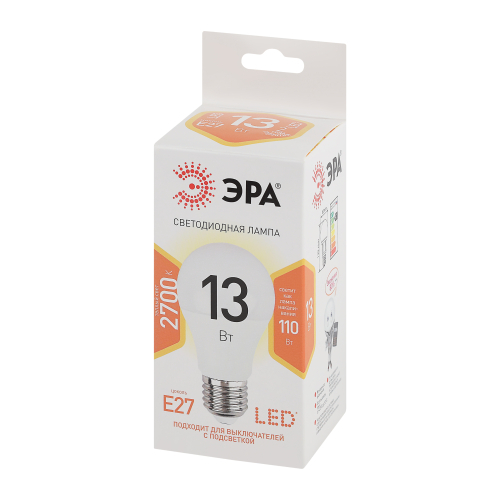 Набор из 10 экономичных светодиодных ламп ЭРА LEDA60-13W-827-E27, тёплый мягкий свет которых идеально подходит для домашнего освещения и замены уходящих в прошлое ламп накаливания. Современная светодиодная технология данных ламп экономит до 90% электроэнергии. Лампы совместимы со стандартными светильниками и люстрами с самым распространённым патроном Е27. Потребляемая мощность 13 Вт. Светят ярко, как лампы накаливания 110 Вт. Размер каждой лампы: 112 х 60 мм.