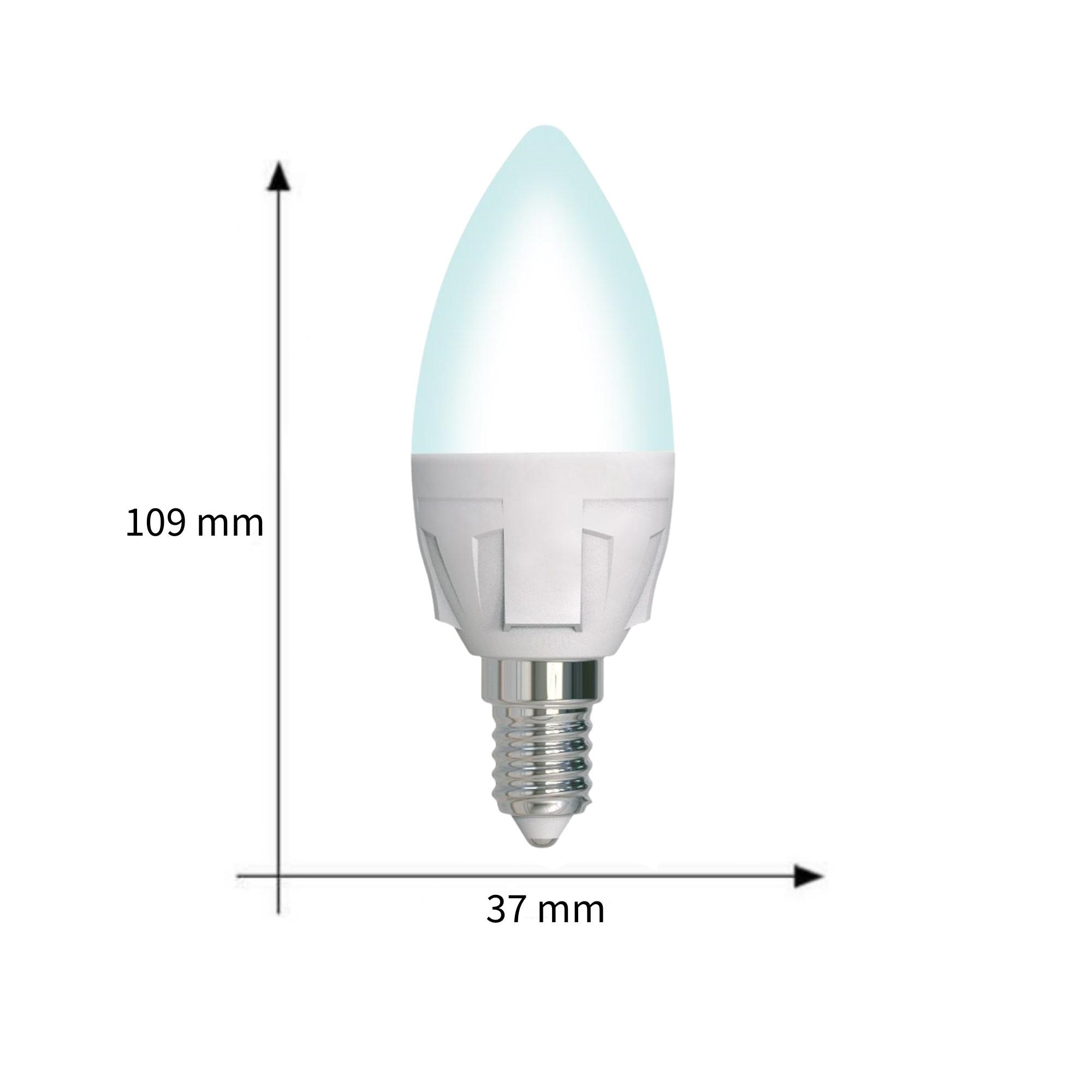 - светодиодные диммируемые лампы с повышенной яркостью и максимально долгим сроком службы. Производство - Россия. Лампы этой серии позволяют экономить до 90% электроэнергии и являются отличной альтернативой обычным лампам накаливания, не теряя высокое качество света. Источником света являются светодиоды, которые не нагревают воздух при работе, устойчивы к внешним воздействиям. Корпус лампы изготовлен из термопластика. Лампа имеет матовую колбу из стекла в форме свечи и стандартный цоколь Е14. Диаметр лампы - 37 мм, угол светового потока 240˚. Свет - белый. Мощность - 7 Вт, что соответствует мощности лампы накаливания 60 Вт. Световой поток 600 лм, цветовая температура - 4000 К.