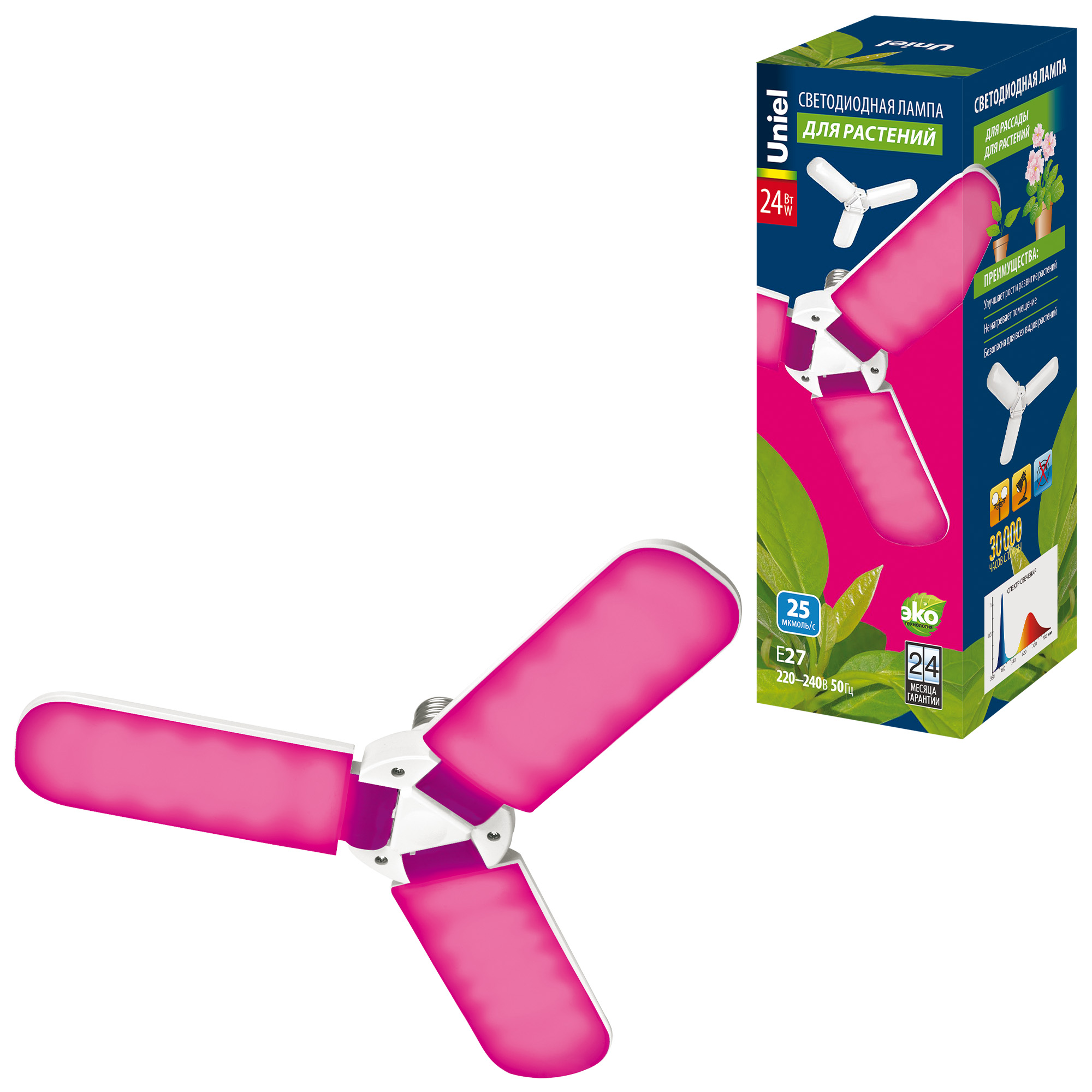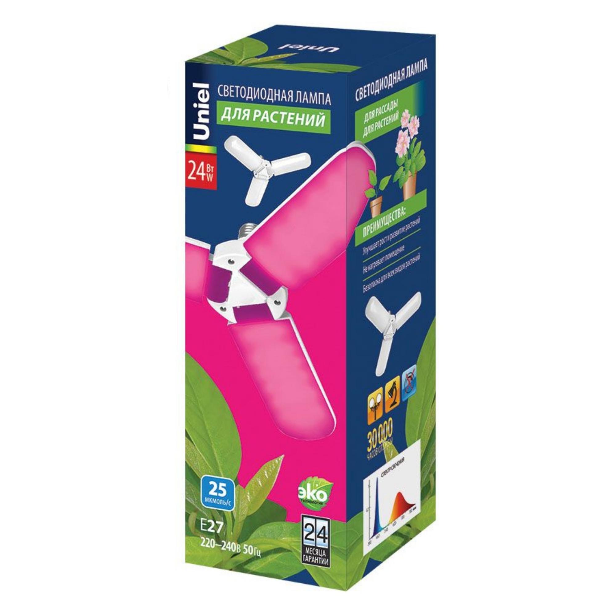 Трёхлепестковая светодиодная фитолампа LED-P65-24W/SPSB/E27/FR/P3 PLP32WH ТМ Uniel со специальным красно-синим спектром разработана специально для досветки рассады, черенков и растений в фазе цветения, укрепляя и стимулируя их рост.