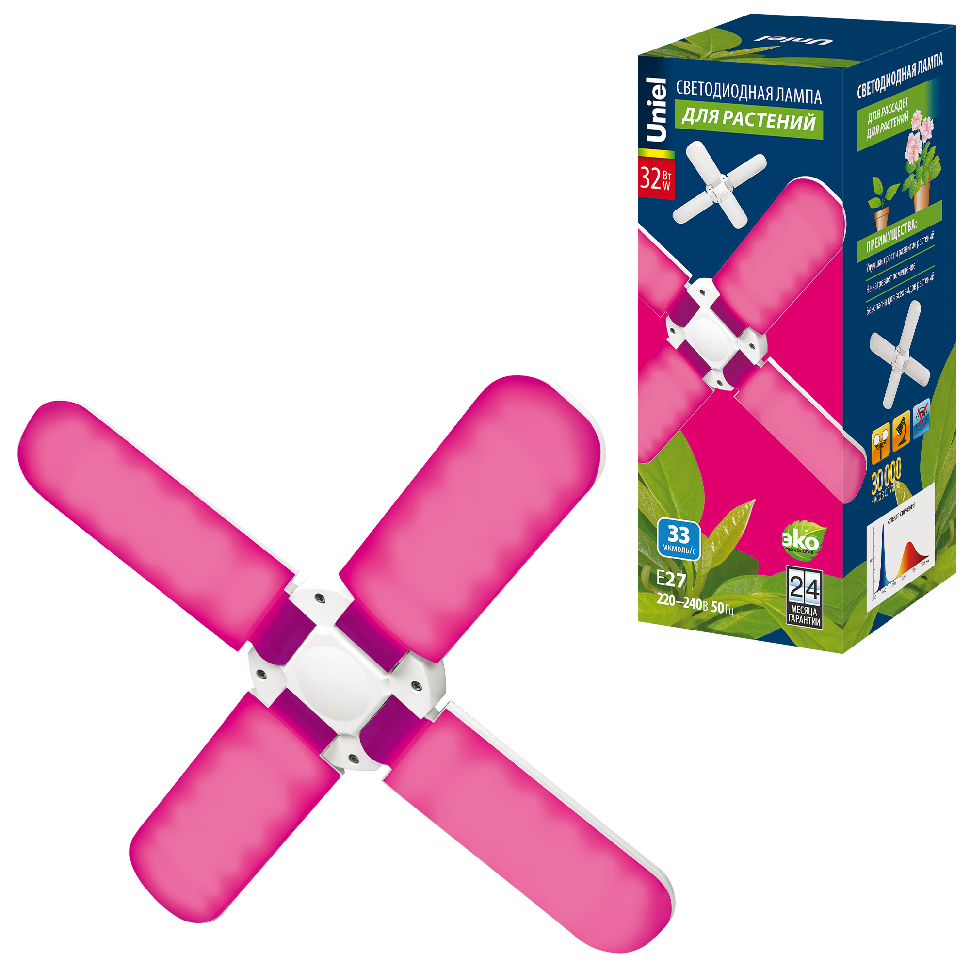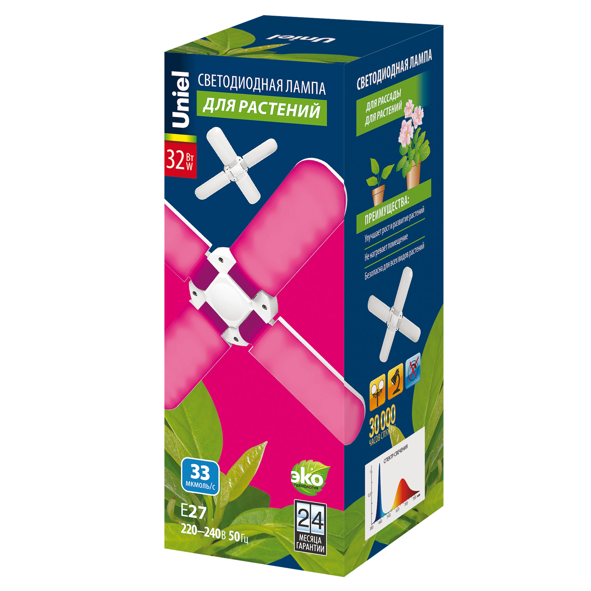 Состоит лампа для растений Uniel из 4 лепестков с углом рассеивания 180º, обеспечивая равномерное и интенсивное освещение большой площади. Лепестки можно фиксировать в 3-х различных положениях и фокусировать световой поток в нужном направлении.