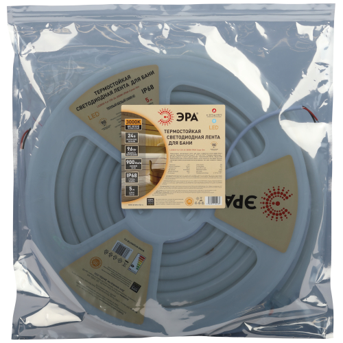 Лента светодиодная термостойкая для бани ЭРА LS2835-9,6-120-24-3000K-IP68-3 year-5m (теплый бел.) со степенью защиты от пыли и влаги IP68 - современный способ создания подсветки и освещения в банях и саунах. Светодиодная лента предназначена для эксплуатации при температурах от -30 ⁰С до + 100 ⁰С. Угол рассеивания 360⁰.. Легко и быстро устанавливается на любой поверхности с помощью крепежей и заглушек, которые есть в комплекте со светодиодной лентой. Светодиодная лента не требует пайки. Для подключения можно использовать коннектор Б0062253 - LS-connector-15mm-D-IP68-bath.. Рабочее напряжение ленты составляет 24В, а мощность равна 9,6 Вт/м. Светодиодная лента обладает световым потоком 900 Лм/м, и цветом свечения - теплый белый (3000 К)