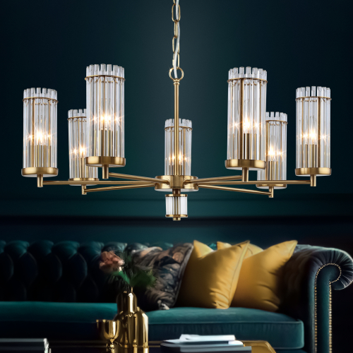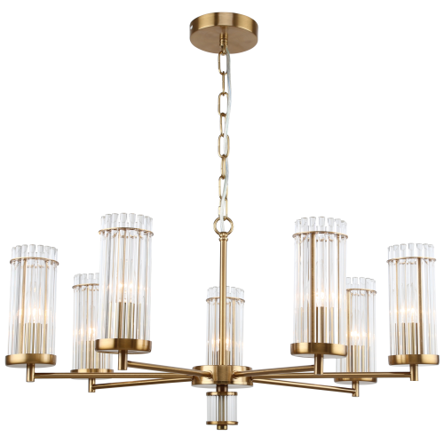 «Фишки» коллекции от итальянских дизайнеров: стеклянные плафоны из прозрачных трубочек, минималистичный золотистый корпус цвета латуни, декорированный эстетичной цепочкой подвес. Высоту подвешивания люстры можно регулировать при монтаже, что делает эту люстру классическую универсальной на любой потолок.
