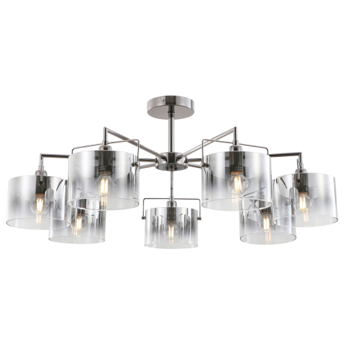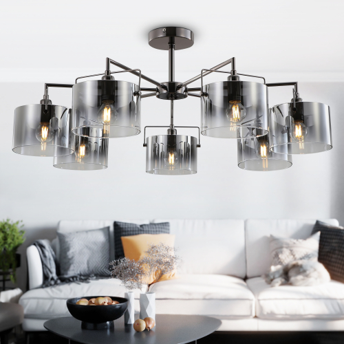 В коллекции Rivoli представлены люстры под 5 и 7 ламп (арт. 2078-305 и 2078-307). Люстры и бра (арт. 2078-401) применяются с лампами Е14 40 Вт. Данная люстра потолочная на штанге имеет 7 стеклянных плафонов в форме абажуров. В сочетании с «телескопическими» рожками подчёркнутой геометрии это делает люстры потолочные прекрасным решением для современных интерьеров – стиль и уют. Арматура люстры имеет стойкое гальваническое покрытие редкого цвета чёрный жемчуг. С этим оттенком гармонично сочетается дымчатое тонирование стекла люстры на потолок. Высота люстры со штангой – 310 мм. Короткая штанга позволяет успешно использовать эти люстры в стандартных жилых комнатах с невысокими потолками или потолками средней высоты. При этом большое количество источников света обеспечит вас ярким качественным освещением.