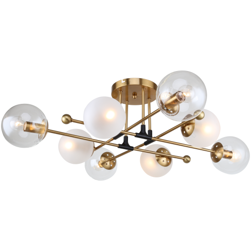 Люстра Rivoli (арт. 3145-308) – эффектная люстра с 8 круглыми стеклянными плафонами – прозрачными и матовыми. Корпус люстры окрашен в цвет латунь и представляет собой оригинальную композицию из перекрёстных металлических реек. Люстра на штанге из металла – выгодная и долговечная покупка. Сочетание стеклянных и матовых плафонов имеет не только декоративную, но и практическую функцию: через прозрачное стекло проходит свет максимальной яркости, через матовое – мягкий и рассеянный. Этот баланс создаёт комфортное для глаз освещение.