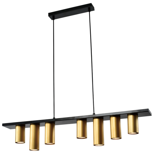 Дизайнерская подвесная люстра в стиле модерн Rivoli (арт. 3168-307) под 7 ламп GU10 25 Вт. Выполнена в эффектном сочетании чёрного и золотого цветов. Цилиндрические плафоны разной высоты расположены на минималистичном вытянутом основании длиной 900 мм. Длину тросов можно отрегулировать при монтаже подвесной люстры, что делает её универсальной для потолков любой высоты.