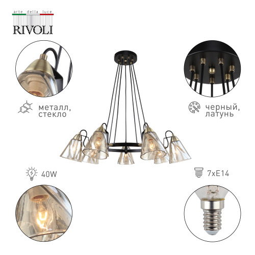 Лаконичный металлический обруч люстры подвесной Rivoli объединяет 7 фигурных стеклянных плафонов с тёплой тонировкой. Смягчая блики и направляя свет вниз, люстры потолочные создают комфортное для глаз освещение. Рекомендуем купить люстры Rivoli c 7 плафонами в гостиную площадью до 21 м2. Эти люстры подвесные на тросах отлично подойдут в загородный дом.