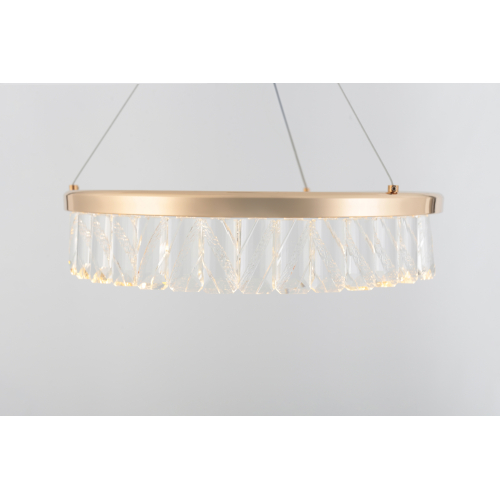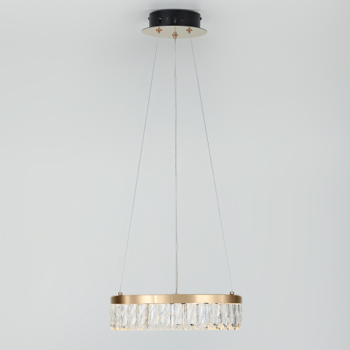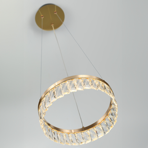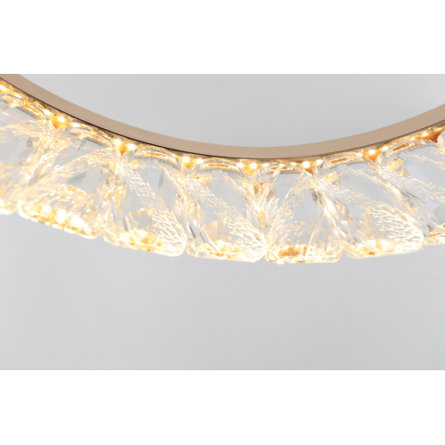 Главной дизайнерской особенностью люстры является большой золотой плафон в форме кольца диаметром 300 мм. Встроенные в плафон-кольцо светодиоды обеспечивают равномерное и мягкое освещение. Подвесная люстра дополнена изысканными хрустальными подвесками с уникальной гравировкой по стеклу, что придаёт ей особый шарм и делает её центральным акцентом в любом интерьере.