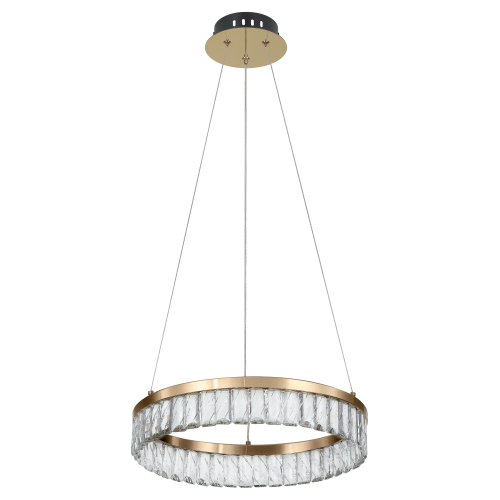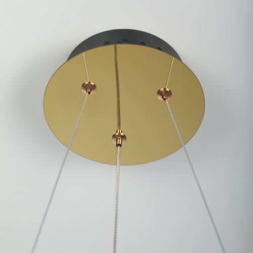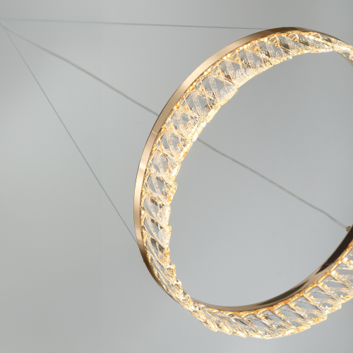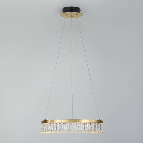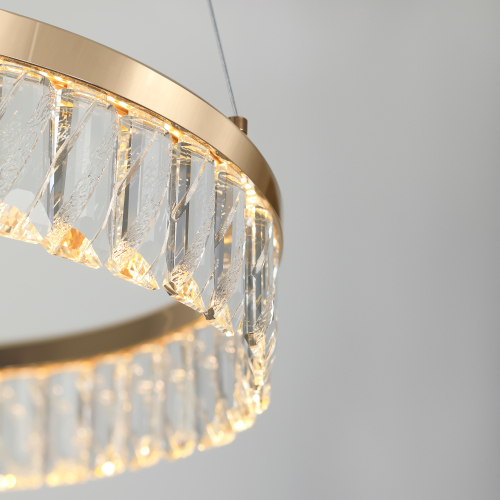 Главной дизайнерской особенностью люстры является большой золотой плафон в форме кольца диаметром 400 мм. Встроенные в плафон-кольцо светодиоды обеспечивают равномерное и мягкое освещение. Подвесная люстра дополнена изысканными хрустальными подвесками с уникальной гравировкой по стеклу, что придаёт ей особый шарм и делает её центральным акцентом в любом интерьере.