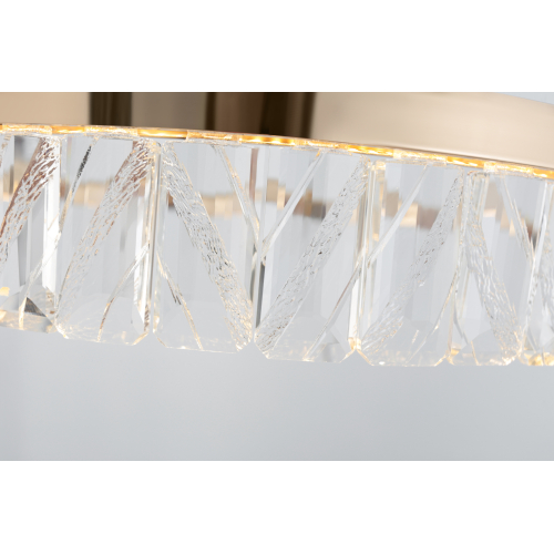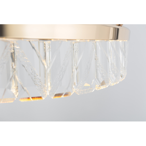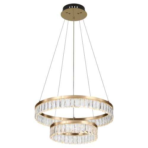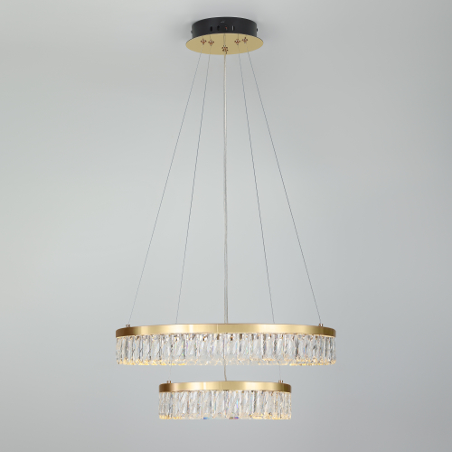 Дизайнерская двухъярусная LED-люстра Rivoli (арт. 6131-105) с оригинальными хрустальными элементами — элегантное современное решение для интерьера, которое гармонично сочетает стиль и функциональность. Мощность люстры составляет 68 Вт, а её два плафона-кольца, выполненные в золотистом оттенке, создают мягкое и уютное освещение благодаря встроенным светодиодам, излучающим тёплый белый свет (3000 К).