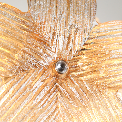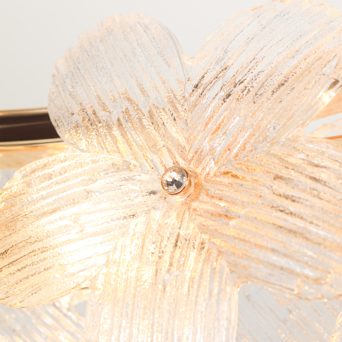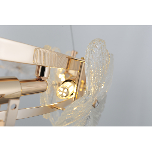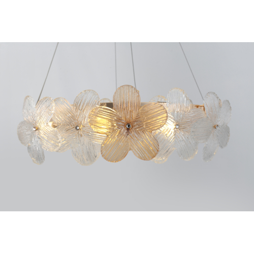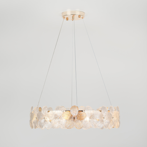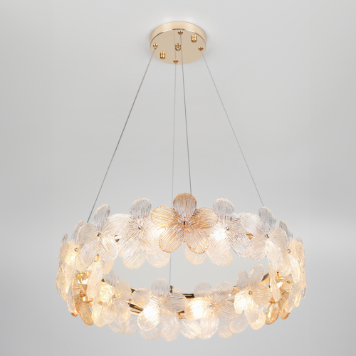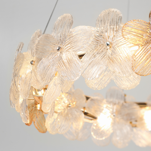 Кольцевой плафон, украшенный стеклянными цветами, придаёт люстре уникальный и художественный вид, делая её центральным акцентом в любом интерьере. С золотой арматурой и диаметром 600 мм люстра не только элегантна, но и функциональна: регулируемая длина подвеса позволяет легко адаптировать её под высоту потолка.