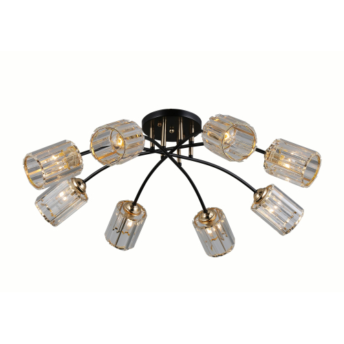 Rivoli (арт. 9101-308) - 8-рожковые люстры с фигурными стеклянными плафонами, имеющими геометричное рифление. Арматура этих современных люстр примечательна своим комбинированным окрашиванием в цвета черный и золото. Прозрачные плафоны декорированы золотистыми элементами.