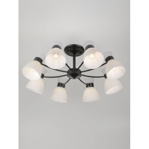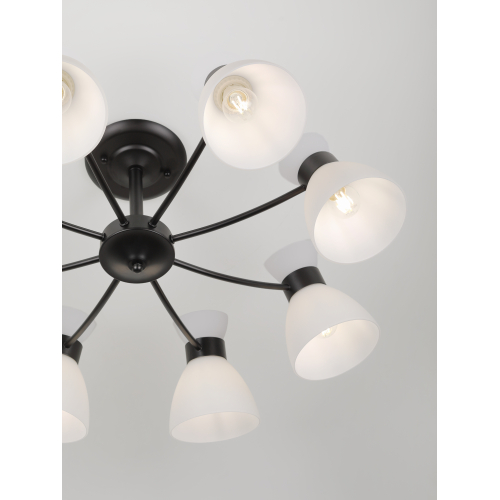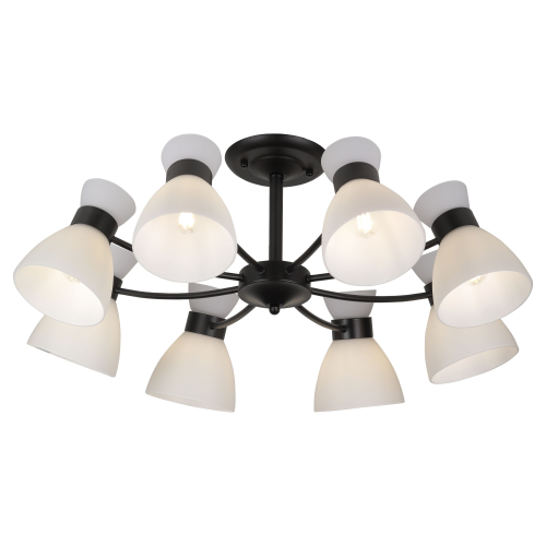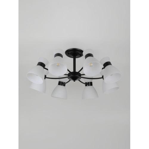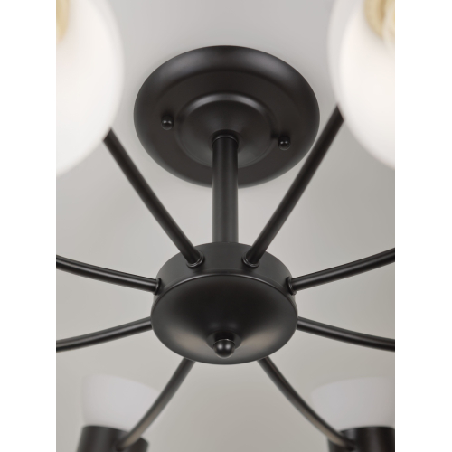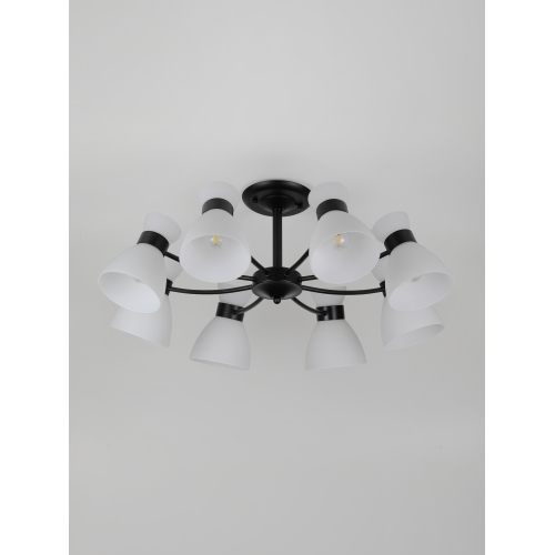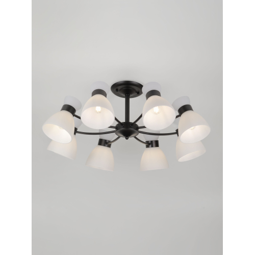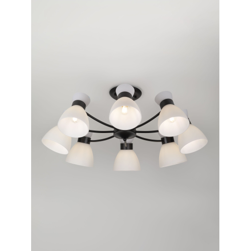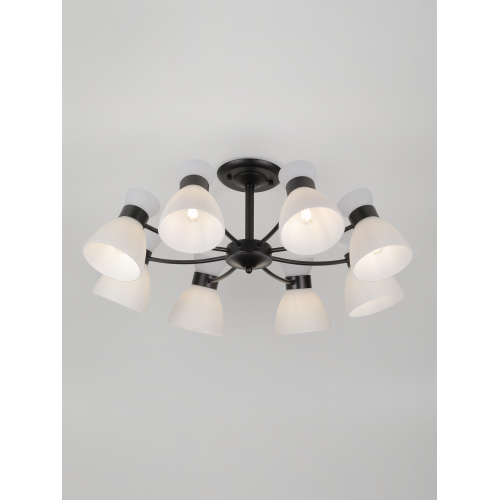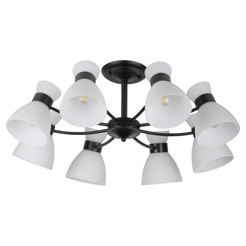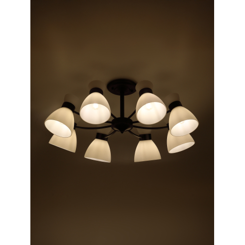 Серия чёрных светильников с опаловыми плафонами — стильное и функциональное решение для современного интерьера. В коллекции люстры на 5 и 8 ламп, а также бра с удобным выключателем-цепочкой. Подходят лампы с цоколем E27, мощностью до 60 Вт (лампы в комплект не входят).