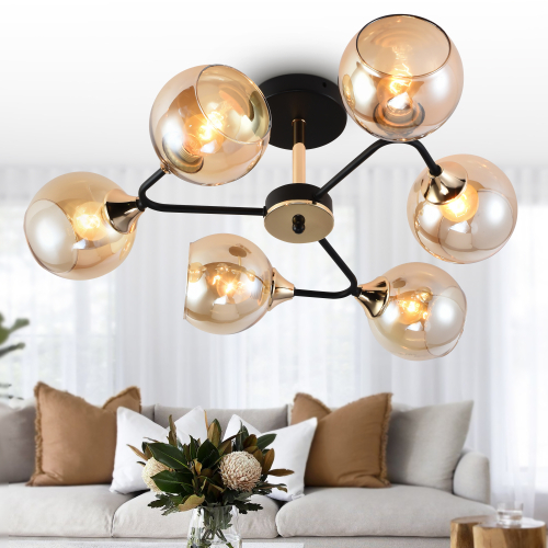Шесть стеклянных плафонов люстры Rivoli Alison (арт. 3138-306) изготовлены из красивого дизайнерского стекла с тонировкой мягкого золотого цвета. Освещаемая площадь этой оригинальной люстры - 18 м2. Черная матовая арматура люстры имеет эффектные изгибы. Плафоны современной люстры Alison итальянского бренда Rivoli расположены на рожках нестандартно. На каждом рожке по 2 плафона - на окончании рожка и на изгибе. Люстры потолочные Alison выглядят эффектно и запоминаются гостям, такие люстры в гостиную - лучшее решение. Люстры Rivoli Alison выполнены в трендовом стиле модерн. Дизайн люстры основан на контрастном сочетании базового черного и яркого золотого цветов.