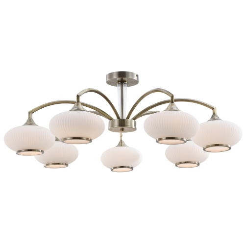 Штанга люстр Rivoli Avarice декорирована «рифлёной» стеклянной колбой. Цвет арматуры люстры – античная бронза, свет ламп направлен вниз. Люстры потолочные Avarice применяются с источниками света Е27 мощностью 60 Вт или их светодиодными аналогами. В коллекции представлены люстры на штанге под 5 ламп (арт. 2077-305) и люстры на штанге под 7 ламп (арт. 2077-307). Дизайнерская коллекция Rivoli Avarice дополнена настенным бра (арт. 2077-401). Плафоны в коллекции выполнены из качественного матового стекла с эффектным рифлением. Форма плафонов – овальная, что выглядит уютно, с отсылками к традициям. Люстры потолочные Avarice Rivoli хорошо смотрятся в центре потолка. Круговое расположение источников света равномерно распределяет световой поток от ламп. Данная люстра на потолок имеет 7 плафонов и подходит для освещения больших по площади помещений.