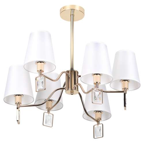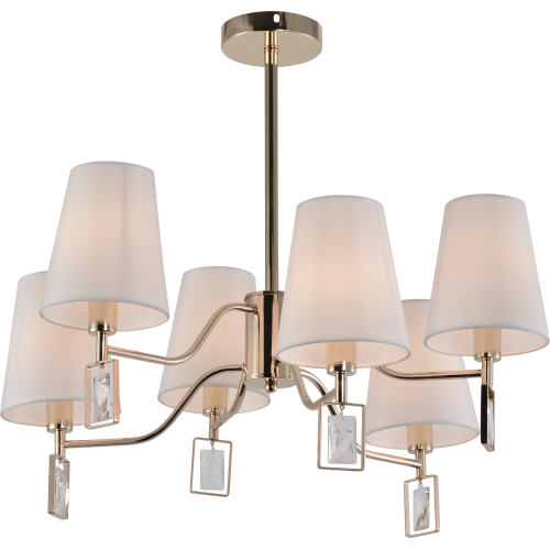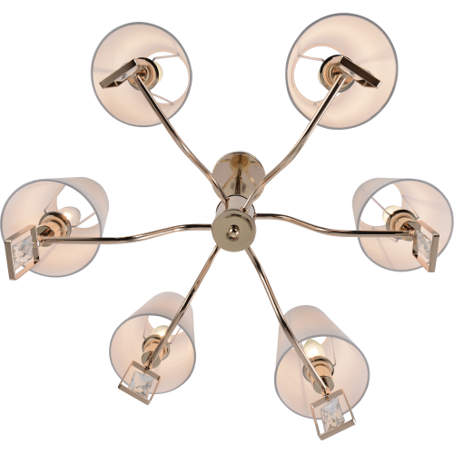 Классическая потолочная люстра Rivoli Cristal (арт. 2095-306) декорирована хрустальными геометричными подвесками. 6-рожковая люстра — прекрасное решение для организации освещения в гостиной. Каждый плафон украшен миниатюрным тканевым абажуром. Цвет арматуры — золото, цвет плафонов — белый. Диаметр этой большой эффектной люстры — 640 мм. Люстры потолочные на штанге — актуальный тренд дизайна интерьеров. Люстра Rivoli Cristal под 5 ламп Е14 40 Вт равномерно освещает комнату площадью до 18 м2. Коллекцию дополняет 8-рожковая люстра (арт. 2095-308) для освещения помещений большей площади и настенный светильник-бра (арт. 2095-401) для прикроватного освещения. Люстры Cristal итальянского бренда Rivoli стоит купить для спальни, гостиной, загородного дома. Эта дизайнерская коллекция также хорошо подходит для пространств сегмента HoReCa — гостиниц, загородных отелей, ресторанов.