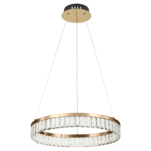 Главной дизайнерской особенностью люстры является большой золотой плафон в форме кольца диаметром 500 мм. Встроенные в плафон-кольцо светодиоды обеспечивают равномерное и мягкое освещение. Подвесная люстра дополнена изысканными хрустальными подвесками с уникальной гравировкой по стеклу, что придаёт ей особый шарм и делает её центральным акцентом в любом интерьере.
