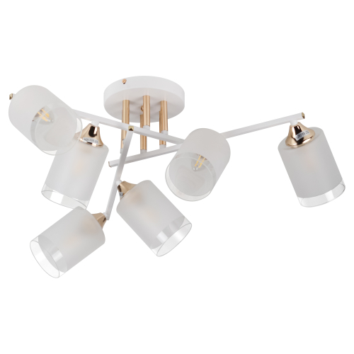В коллекции Rivoli Georgiana представлены люстры с 4 плафонами (арт. 9144-203) и люстры с 6 плафонами (арт. 9144-205). Данная люстра потолочная под 6 ламп Е27 60 Вт предназначена для освещения площади до 18 м2, а значит подойдёт для гостиной, спальни и любой комнаты средней или большой площади. Рожки люстры выполнены в виде металлических реек, окрашенных в белый цвет. Основной цвет корпуса люстры дизайнерской Georgiana – белый, эффектный вид люстре придают детали золотого цвета. Матовые плафоны имеют прозрачный декоративный ободок. Люстры с матовыми плафонами хорошо подходят для жилых пространств, так как делают искусственное освещение более мягким.