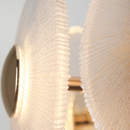 Отличительной особенностью этой нежной коллекции от европейских дизайнеров стали круглые прозрачные плафоны из стекла с декоративным рифлением. Встроенные светодиоды последнего поколения создают мягкое тёплое свечение с цветовой температурой 3000 К. Арматура коллекции окрашена в красивый золотой оттенок.