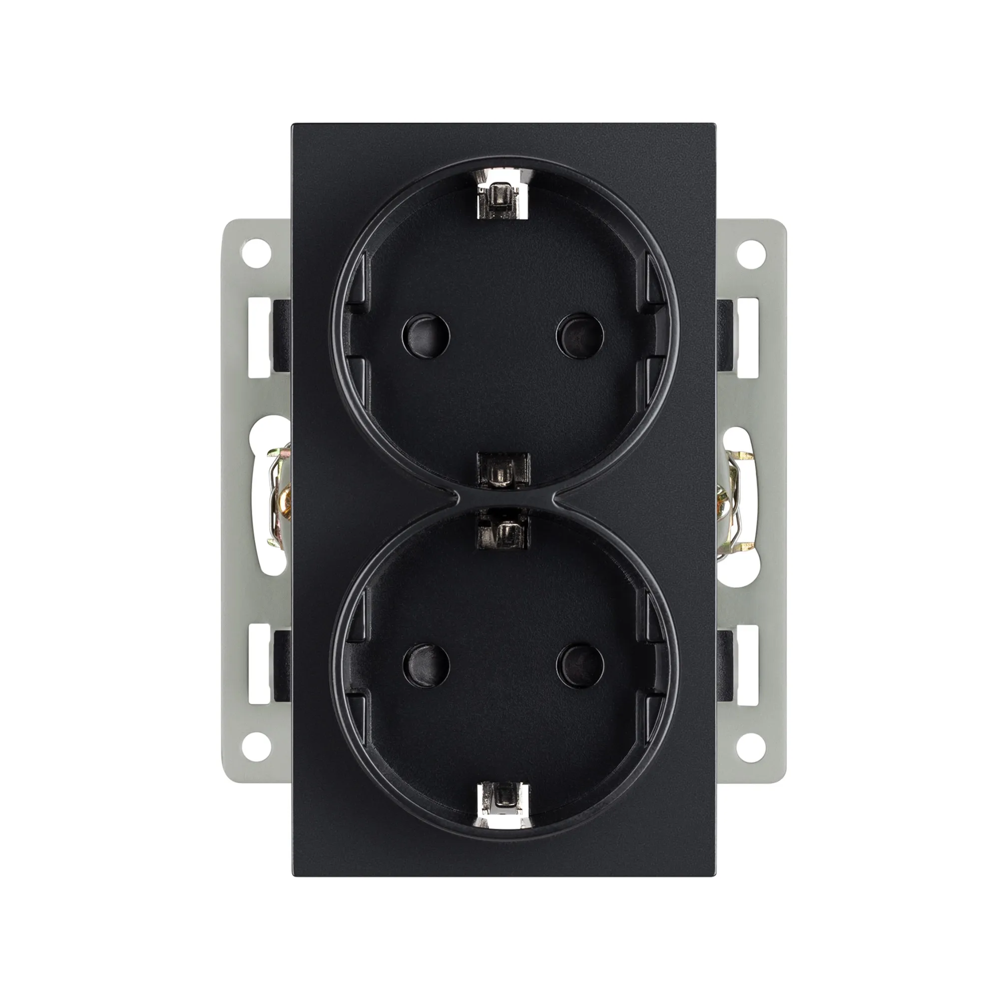 Механизм сдвоенной розетки с заземлением на 2 поста, совместим с рамками вертикального ориентирования монтажа серий VERSA/GLARE/PRESTO. Накладной тип монтажа позволяет с легкостью произвести монтаж/замену. Видимая часть механизма выполнена из высококачественного тугоплавкого пластика черного цвета. Контактная часть присоединяется при помощи винтовых зажимов, а усиленные монтажные лапки надежно фиксируют механизм в установочном подрозетнике.