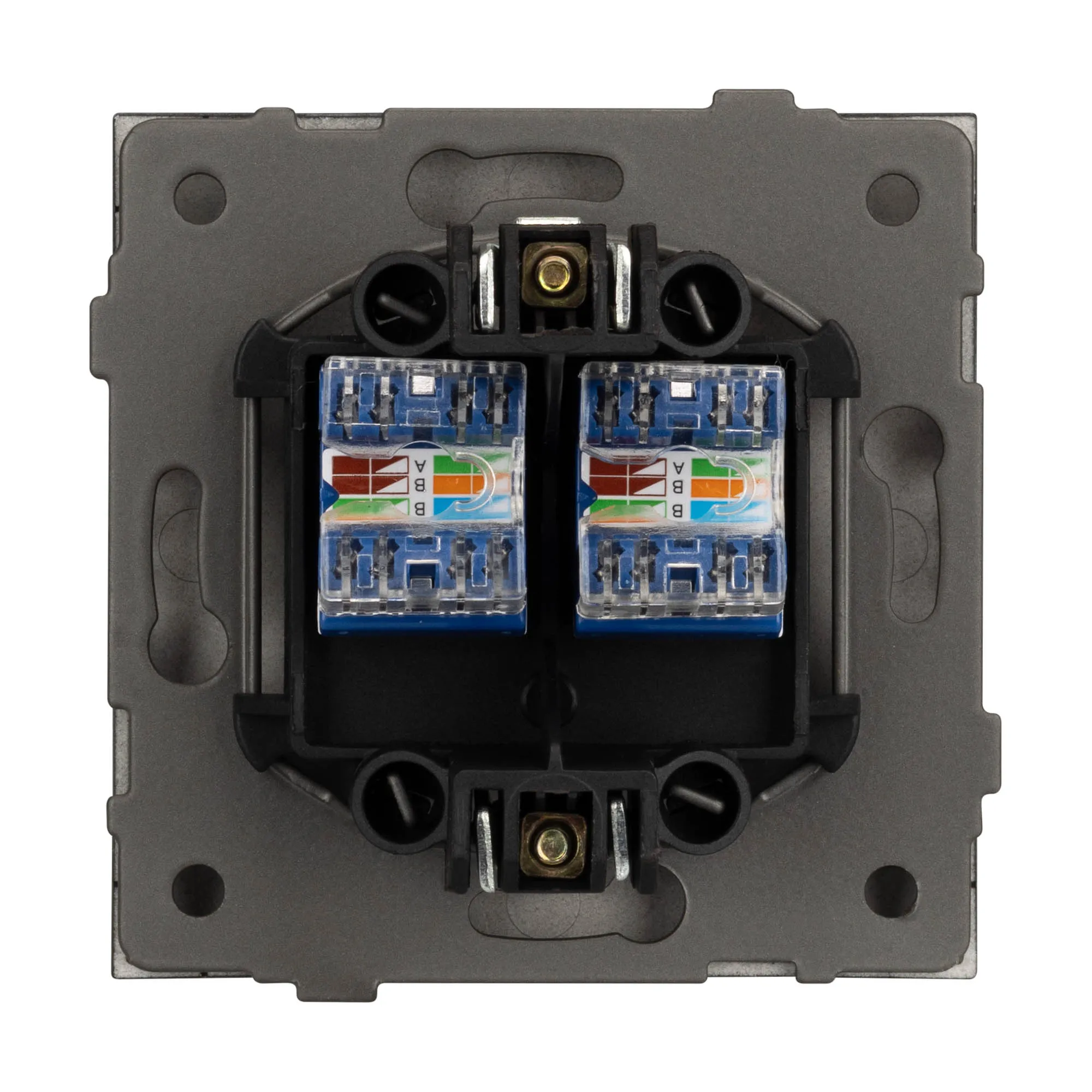Выходной порт RJ-45 (Female) формата 8P8C соответствует категории 6 (Cat.6), что поддерживает высокоскоростные соединения до 10 Гбит/с на расстоянии до 55 метров. Откидная крышка защищает выходной порт от повреждения и загрязнения внешних контактов разъема. Контактная часть выполнена по технологии IPC (изоляционно–пробивающего контакта) с нанесением цветной маркировки схемы разводки на корпус, позволяя быстро и легко подсоединить механизм компьютерной розетки к большинству многожильных кабелей типа UTP (неэкранированные).