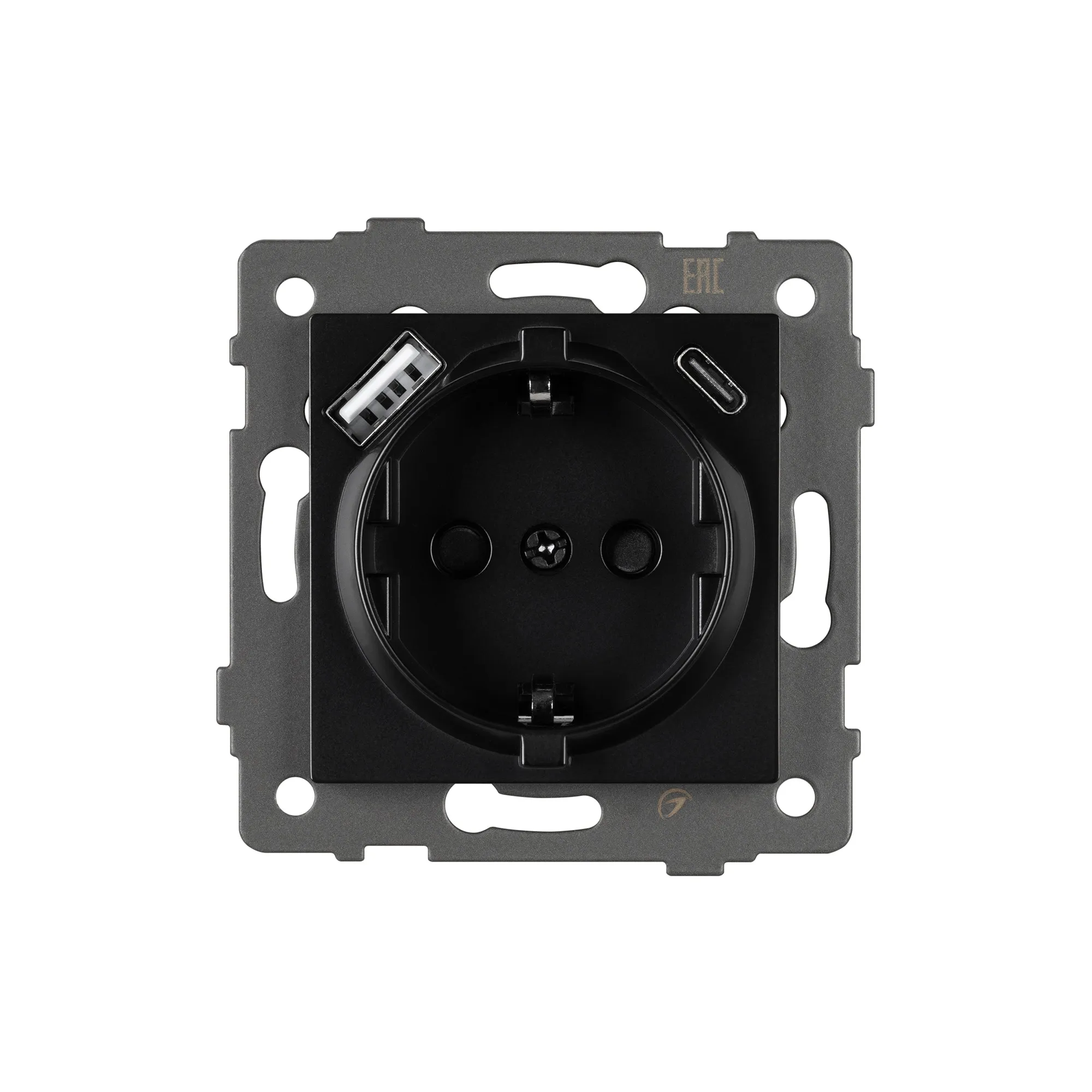 Механизм розетки с заземлением совместим с рамками серий OMALI/AKYRI/PERIO/XSILO. Скрытый тип монтажа позволяет гармонично встроить в интерьер любого современного дизайн-проекта. Видимая часть механизма выполнена из высококачественного пластика черного цвета. Контактная часть присоединяется при помощи винтовых зажимов, а усиленные распорные лапки надежно фиксируют механизм в установочном подрозетнике. Дополнительно встроены два зарядных порта USB Type A + Type C. Зарядный порт USB Type C с поддержкой протокола быстрой зарядки Quick Charge 3 (совместимо с протоколами Adaptive Fast Charging (Samsung); Huawei Super Charge; Power Delivery (Apple)).