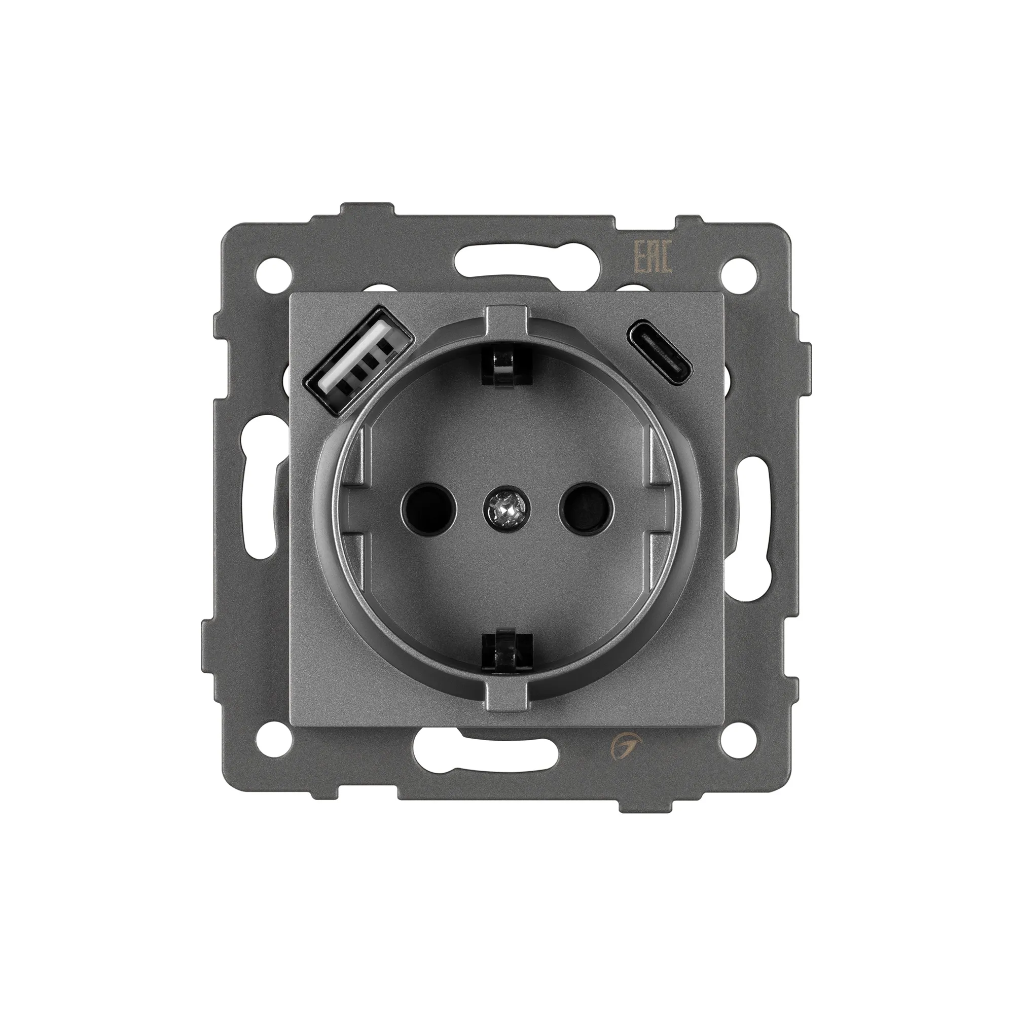 Механизм розетки с заземлением из серии M совместим с рамками серий OMALI/AKYRI/PERIO/XSILO. Скрытый тип монтажа позволяет гармонично встроить в интерьер любого современного дизайн-проекта. Видимая часть механизма выполнена из высококачественного пластика серого цвета. Контактная часть присоединяется при помощи винтовых зажимов, а усиленные монтажные лапки надежно фиксируют механизм в установочном подрозетнике. Дополнительно встроены два зарядных порта USB Type A + Type C. Зарядный порт USB Type C с поддержкой протокола быстрой зарядки Quick Charge 3 (совместимо с протоколами Adaptive Fast Charging (Samsung); Huawei Super Charge; Power Delivery (Apple)).