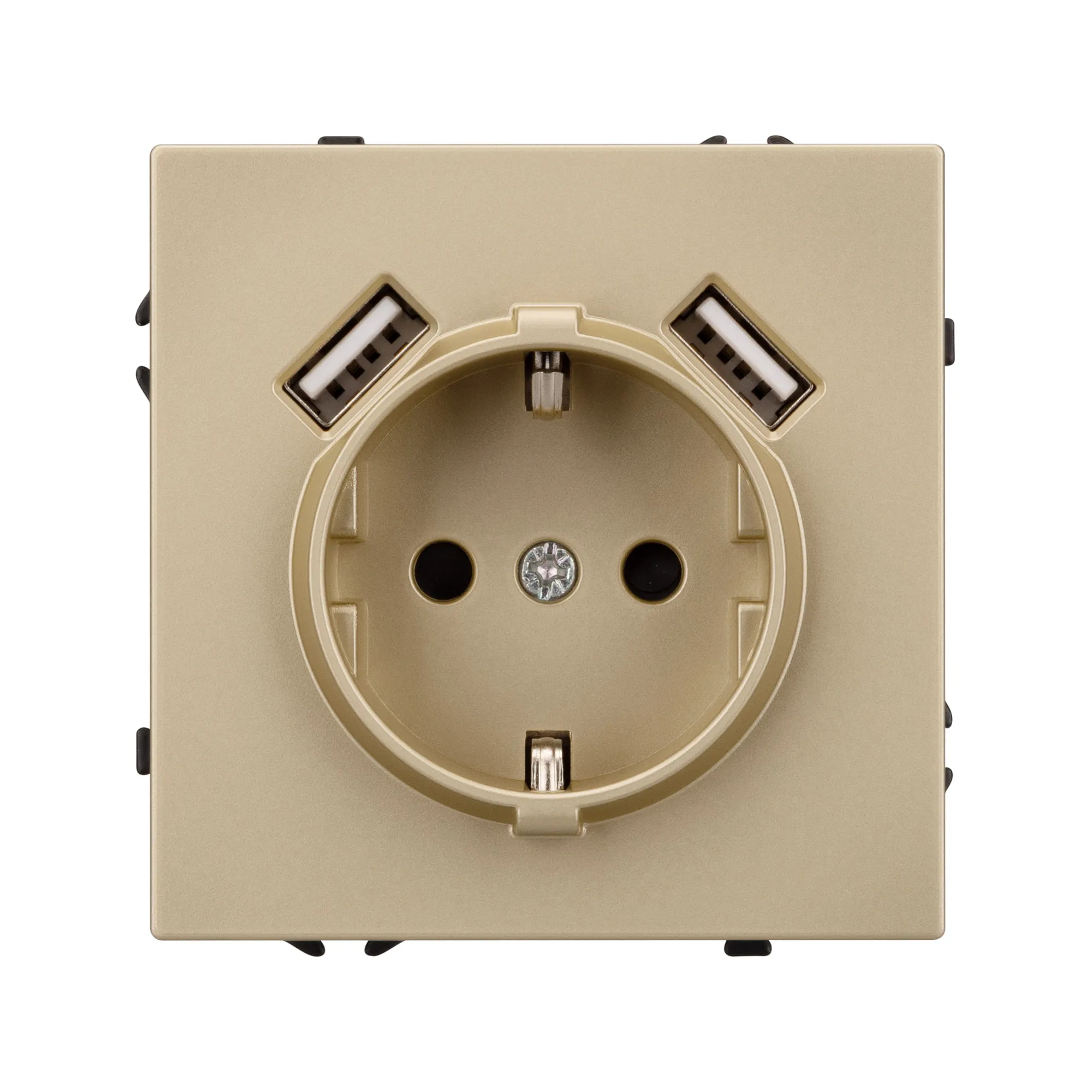 Механизм розетки с USB зарядкой, совместимый с рамками серии NOBE, создает утонченный минималистичный вид. Наличие двух USB Type A портов позволяет существенно сократить количество используемых розеточных постов под евровилку, сохраняя единую стилистику интерьера всего современного дизайн-проекта. Видимая часть механизма выполнена из высококачественного пластика цвета золотой песок и имеет Soft-Touch покрытие, что придает изделию приятные тактильные ощущения и стильный внешний вид.