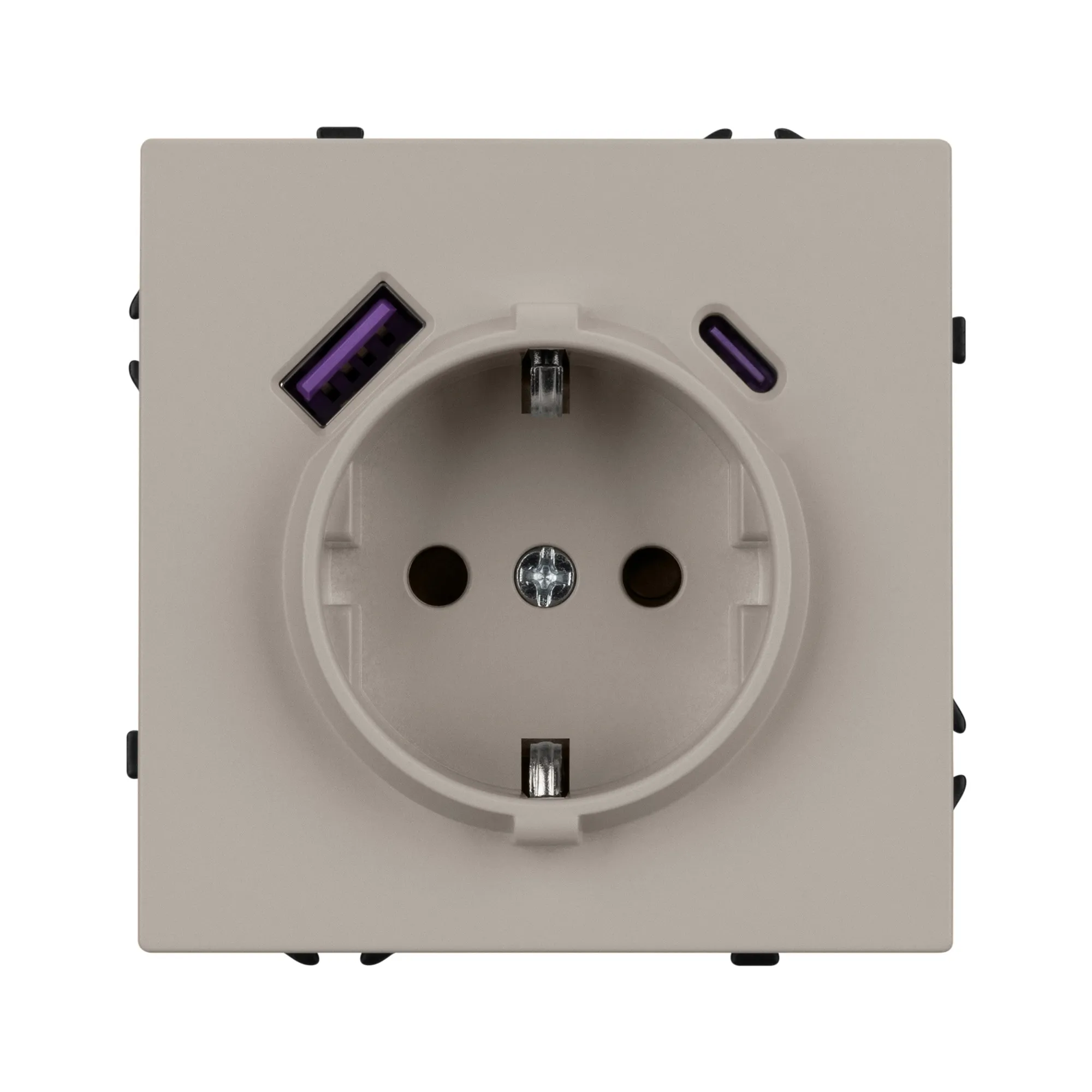 Механизм розетки с USB зарядкой, совместимый с рамками серии NOBE, создает утонченный минималистичный вид. Наличие USB Type A и Type C портов позволяет существенно сократить количество используемых розеточных постов под евровилку, сохраняя единую стилистику интерьера всего современного дизайн-проекта. Оба разъема поддерживают протокол быстрой зарядки Quick Charge QC 3.0, помимо этого для разъема Type C доступен протокол Power Delivery*.