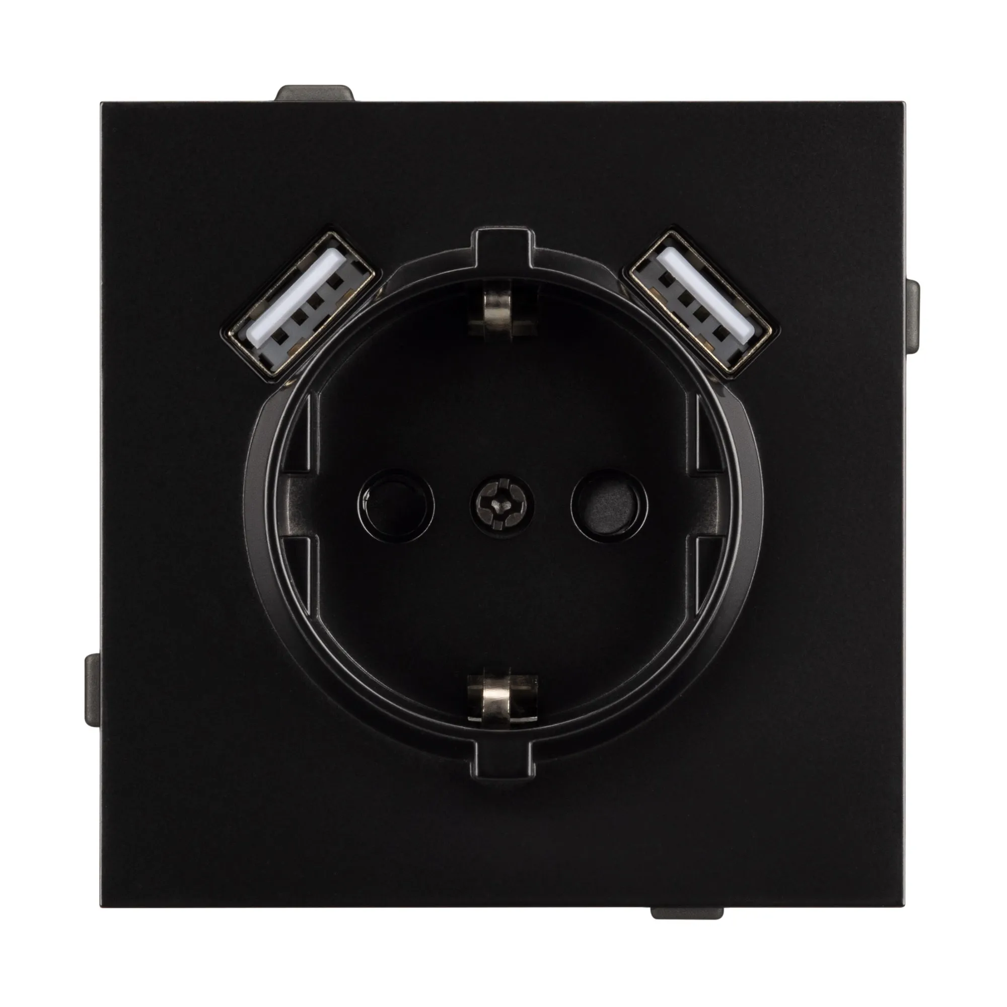Механизм розетки с USB зарядкой, совместимый с рамками серии TENDO, создает утонченный минималистичный вид. Наличие двух USB Type A портов позволяет существенно сократить количество используемых розеточных постов под евровилку, сохраняя единую стилистику интерьера всего современного дизайн-проекта. Видимая часть механизма выполнена из высококачественного пластика черного цвета и имеет матовое покрытие, что придает изделию приятные тактильные ощущения и стильный внешний вид.