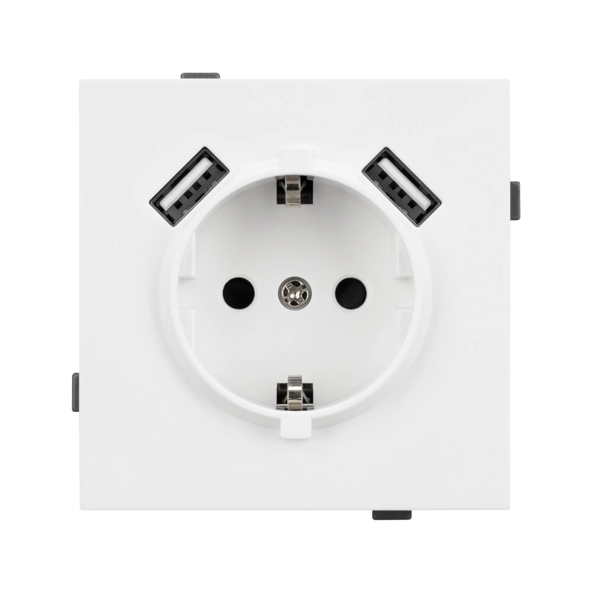 Механизм розетки с USB зарядкой, совместимый с рамками серии TENDO, создает утонченный минималистичный вид. Наличие двух USB Type A портов позволяет существенно сократить количество используемых розеточных постов под евровилку, сохраняя единую стилистику интерьера всего современного дизайн-проекта. Видимая часть механизма выполнена из высококачественного пластика белого цвета и имеет матовое покрытие, что придает изделию приятные тактильные ощущения и стильный внешний вид.